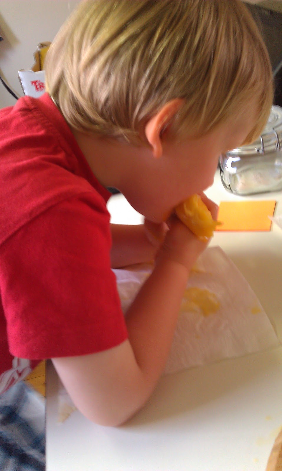 Then we got cracking with some real cooking! We pureed another mango, along with the seeds scraped out of a fat, juicy vanilla pod. Then came a lot of patience and a necessary trip to Great-Grandma’s house to avoid the temptation of dipping our fingers in the pot (both of us struggled with this, not just Mr T)…. We came home to find, still waiting on the counter for us, over a litre of delicious mango and vanilla bean YOGHURT! Wooohoooo, I finally made yoghurt! I don’t know why/how it has taken me so long. I’ve owned my thermomix for 9 months and I’ve only just made yoghurt?!? I could make a baby in that time! Anyway, yay for me, I finally did it. I was a bit nervous, because I added the fruit in early rather than setting the yoghurt and then stirring the fruit in… It can make the yoghurt less likely to set. But not this time! It set beautifully, and it tastes fantastic!